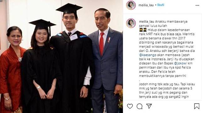 Usai Ungkap Kekesalan Pada Kaesang Pangarep Ibunda Felicia Tissue Minta Maaf Showbiz Liputan6 Com from cdn0-production-images-kly.akamaized.net Kaesang menghapus semua foto felicia tissue dari laman instagramnya. Felicia tissue mengakhiri pernyataannya, ia ingin menjalani hidupnya secara legowo dan tidak diusik. Meski begitu, tribunnewsbogor.com masih berupaya mengkonfirmasi felicia tissue via pesan singkat (dm), namun belum ada balasan hingga. Mantan kekasih putra presiden joko widodo (jokowi) kaesang pangarep, yakni felicia tissue, melaporkan warganet (netizen) yang menghinanya ke polisi singapura. Felicia rupanya membenarkan omongan sang ibunda, meilia lau, kalau kaesang pangarep belum meminta maaf padanya. Hal tersebut diungkapkan oleh felicia dalam sebuah video di kanal youtube pribadinya dengan judul 'the revelation'. Nomor ponsel felicia tissue diblokir oleh kaesang pangarep. Home tags keluarga felicia tissue.